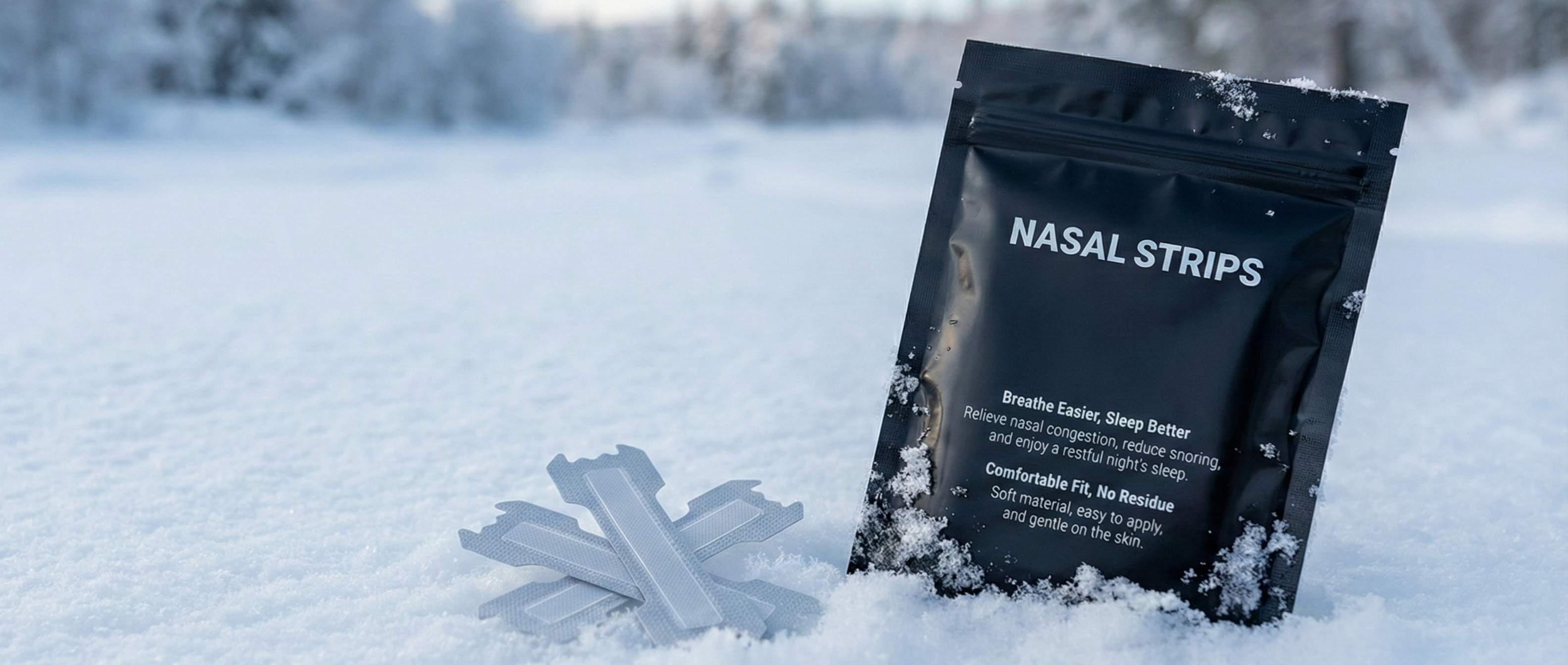 Nasal strips are small, flexible bands placed across the bridge of the nose. They gently lift the nasal passages to open your airways, allowing you to breathe easier and deeper day or night.